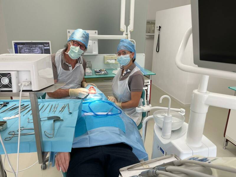 Op de tanden en kiezen wordt een blokjesbeugel geplaatst. Vlak daarna wordt een kleine operatie uitgevoerd waarbij het oppervlak van het bot wordt bewerkt (bonescarven) en kunstbot wordt aangebracht. De ingreep wordt goed verdoofd en is daardoor niet pijnlijk. Eventueel kan napijn met pijnstillers worden opgevangen. De operatie duurt ongeveer een uur. Er ontstaat wat zwelling maar deze is na een paar dagen weer verdwenen. Na tien dagen worden de hechtingen verwijderd.
